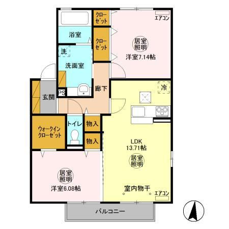| 間取り | 2LDK | 間取り詳細 | LDK13.71 洋室6.08 洋室7.14 | 専有面積 | 68.64㎡ |